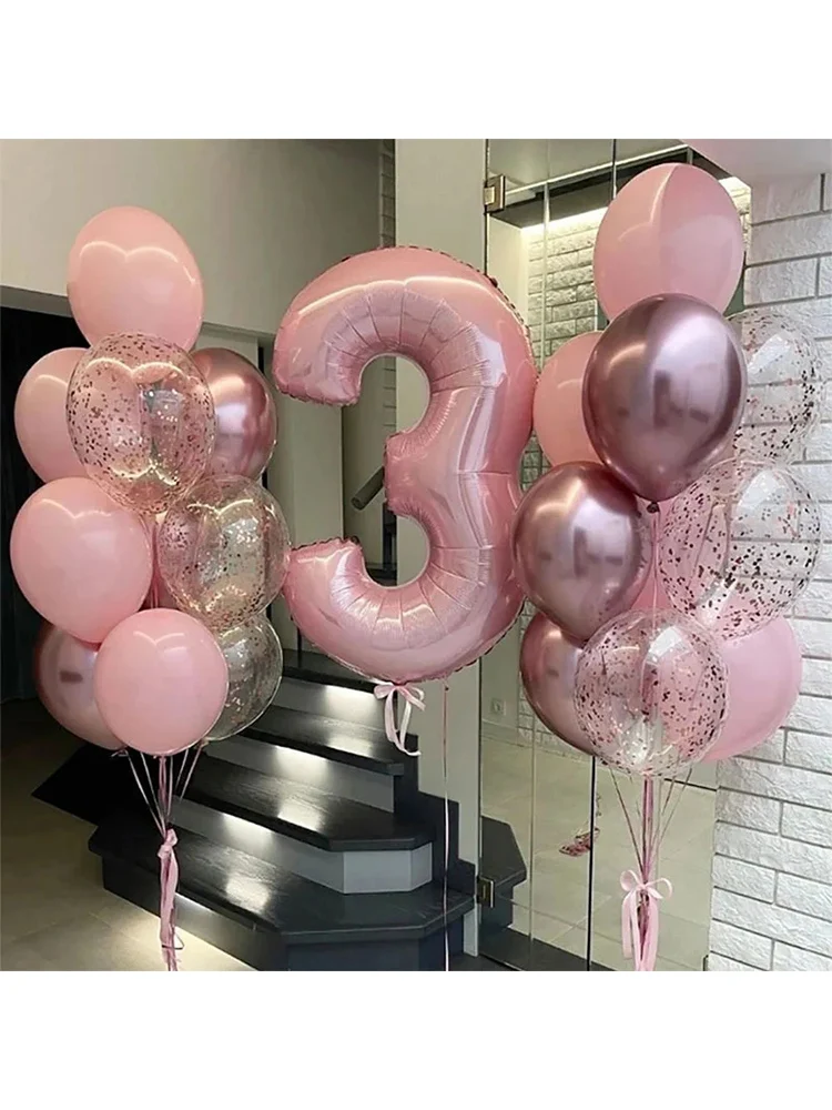 21pcs Pink 40inch Number Foil Latex Balloons Happy Birthday Party Decorations Kids Girl Baby 1 2 3 4 5 6 7 8 9 Year Old Supplies