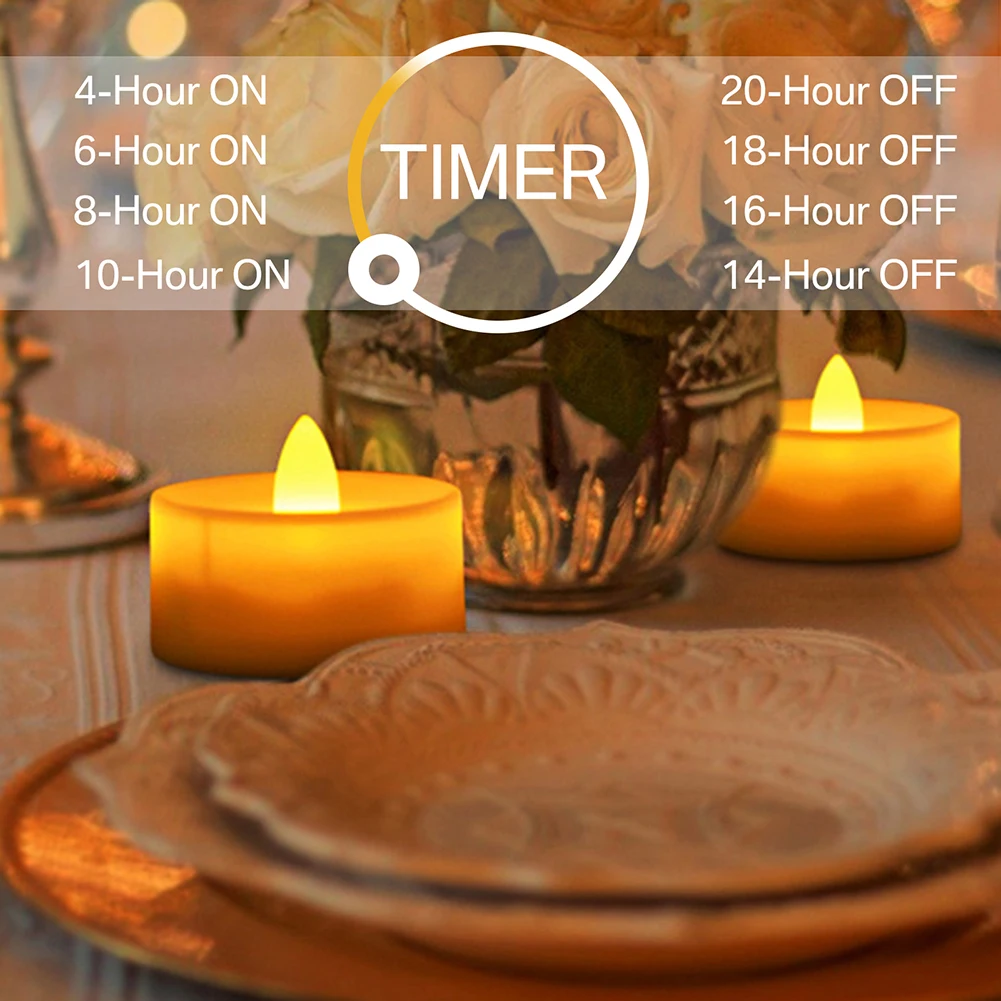 [BUILT IN TIMER ] Simply move the switch to the “on” position and the flameless tea light will light for 6 hours, then light off 18 hours auto, cycle in every 24 hours without other operation unless you wanna reset the beginning time; Saving much trouble of turning it on and off every day. (No Remote)
