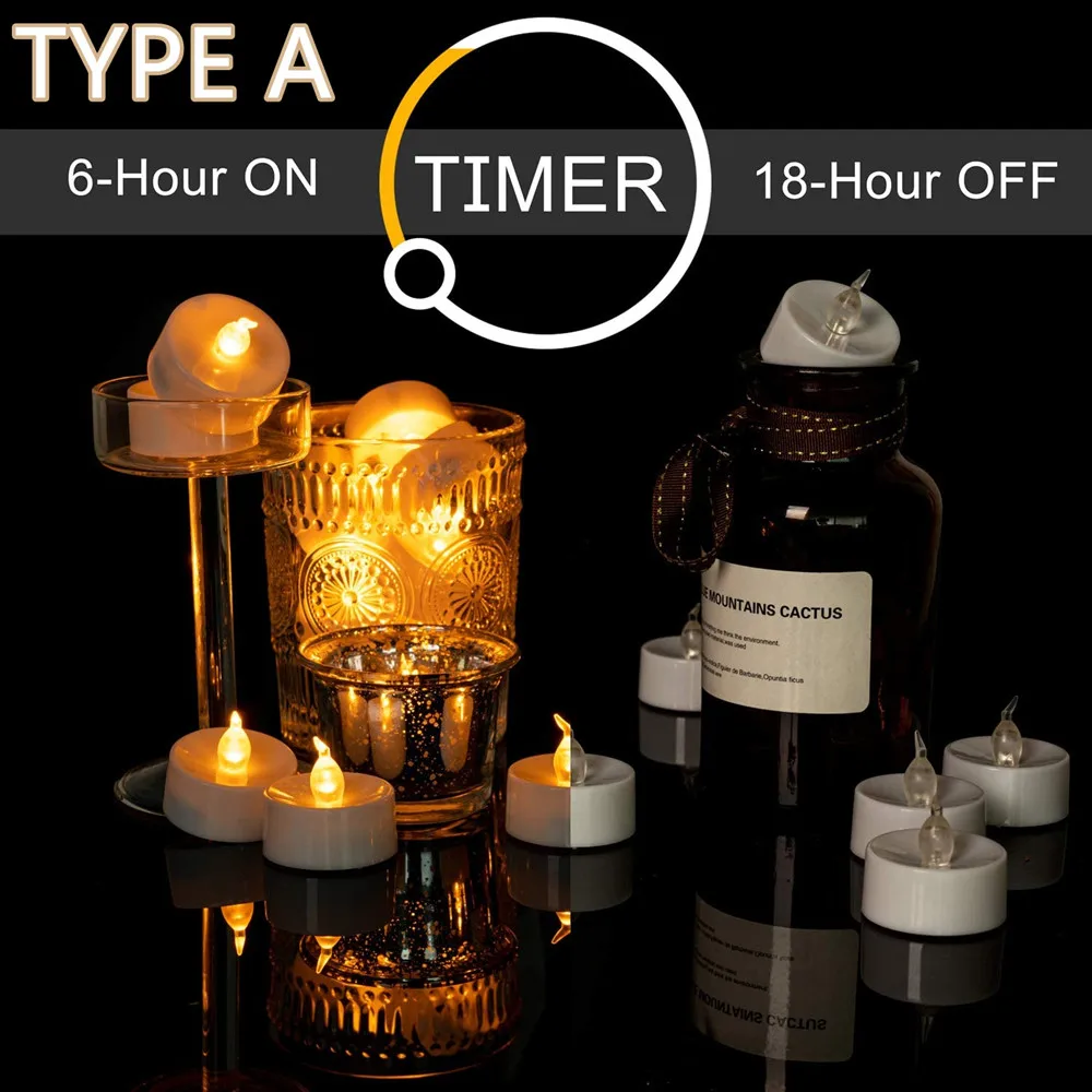 [BUILT IN TIMER ] Simply move the switch to the “on” position and the flameless tea light will light for 6 hours, then light off 18 hours auto, cycle in every 24 hours without other operation unless you wanna reset the beginning time; Saving much trouble of turning it on and off every day. (No Remote)
